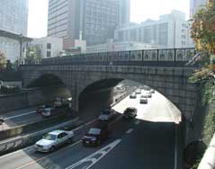 1962年(昭和37年)に埋め立てられた築地川にかかる橋。現在は高速道路を下に銀座と築地を結んでいる。 |