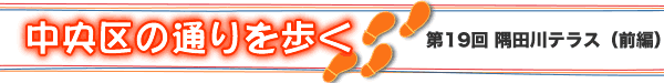 川からの風が心地よく、花壇に咲く色とりどりの草花が目を楽しませるテラスは、夏の散策にぴったりの場所。そこで、今回はこれまで歩いてきた一般の道路から少し離れ、中央区内の隅田川テラスを歩きます。第19回の前編は、台東区、墨田区との区界、両国橋付近からスタート。東日本橋、日本橋浜町、日本橋中洲、日本橋箱崎町、新川周辺のテラスを通り、隅田川沿いを南下します。