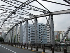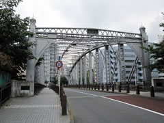 取材前に隅田川に架かる橋について調べていたら、偶然にもおもしろい事実を発見! そこで駆けつけたのが、この南高橋。なんと! 南高橋のトラス部分は、明治37年に架設された一代前の旧・両国橋から移築されたものなんです。 当時の両国橋は三連トラスの鉄橋でしたが、関東大震災で損壊。現橋に架け替えざるを得なくなったものの、破損の少なかった中央のトラス部分を再利用して、昭和7年、南高橋が創架されたのでした。