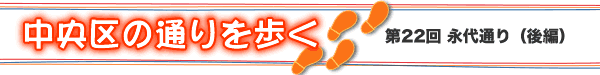 第22回では、中央区内を通る永代通りについて、通り沿いの日本橋兜町、日本橋茅場町、新川界隈などをご紹介します。