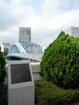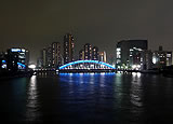 橋の名前の由来には諸説あり、橋を渡す江東区側の付近一帯が当時「永代島」と呼ばれていたから、あるいは、幕府が末永く代々続くようにとの慶賀の意味から、とも言われています。江戸時代の永代橋は、眺望、納涼の名所として庶民に大変親しまれました。現在の橋も、日没後にはブルーの灯りでライトアップされ、その美しい姿は通りを行き交う人たちを立ち止まらせます。夜の永代橋は、中央区の「夜景八選」に選定されています。