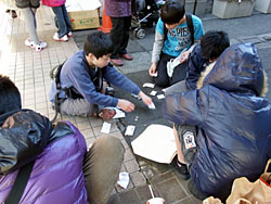 はじまる午後3時過ぎに、どこからこれほどの人数が集まるのかと不思議に思うほど、子供たちのグループや家族ぐるみの人で溢れかえる。場所は3か所で豆まきは、3時20分、40分、4時、4時20分、40分の5回。私も引っ越してから3回ほど参加したが、始まる時のわくわく感は楽しい。やはりお金が入っているので、皆の期待は膨らむようである。