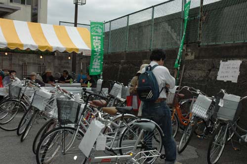 6月4日(日)、午前10時からリサイクルハウスかざぐるま箱崎町(日本橋箱崎町36-15)で、「MOTTAINAI」が地球を救うをモットーに「第3回エコまつり」が開催されました。会場では、学校給食の残さから作った堆肥で育ったキャベツを利用して、お好み焼きの試食が行われ、小さな子どもから大人まで多くの来場者がおいしそうに食べていました。リサイクル自転車の販売コーナーでは、放置自転車として撤去した自転車を自転車商組合が修理して、6,000円で販売しましたが、展示されたピカピカの自転車20台に多くの来場者が申し込み、抽選で盛り上がりました。このほかにも、新聞紙を使ってブローチを作ったり、区内の公園であらかじめ収集した小枝を使ってペーパーナイフを作るなど、900人を超える来場者で終日賑わいました。