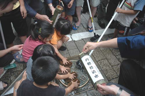 23日(日)、町会、交通少年団、消防少年団、近隣のデパート・商店、会社の人たちが、天下の名橋「日本橋」で、年1回恒例のアカ落とし行事、今年で36回を迎える「日本橋橋洗い」は、1300人が参加して行われました。参加者はたわし、デッキブラシ、バケツ、サンドペーパーなどの清掃用具を持ち、消防団が散水した所から洗剤を含ましたたわしなどで、泡を作りながら、ていねいに磨いていました。最後は、橋ばかりでなく川もきれいにしようと、元気だんご(EM有用微生物群の入ったどろだんご)を3000個、号令により一斉に橋の上から投げ入れました。