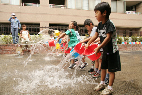 ◆ 初期消火訓練……オイルパンを使って実際の火を消火