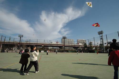 1月4日(木)、穏やかな晴天に恵まれ、中央区立浜町公園(中央区浜町2-59-1)内にある運動場で、「日本の凧の会」と「青少年対策日本橋六の部地区委員会」の主催により「新春こども凧あげ大会」が行われました。