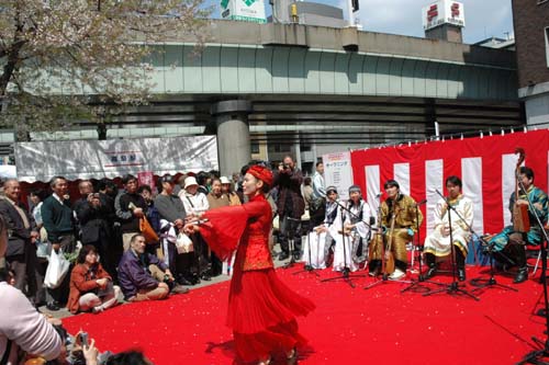 日本の三味線の起源は、キルギスの楽器コムズであるといわれ、日本橋は、音楽回廊であるアジア・シルクロードの終着駅であることから日本橋とキルギスは密接に結びついています。 セレモニーの後、キルギスの民族音楽や民族舞踊が披露され、集まった人々は興味深げに耳を傾けていました。