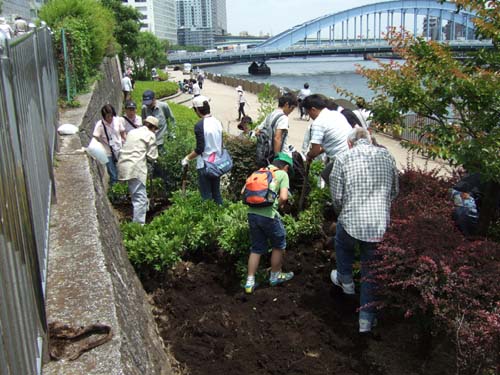 6月2日(土)、隅田川テラスで「隅田川グリーンアップ・プロジェクト」が実施され、区民の方々や「中央ぷらねっと」のメンバー等、約150人が緑化活動に汗を流しました。