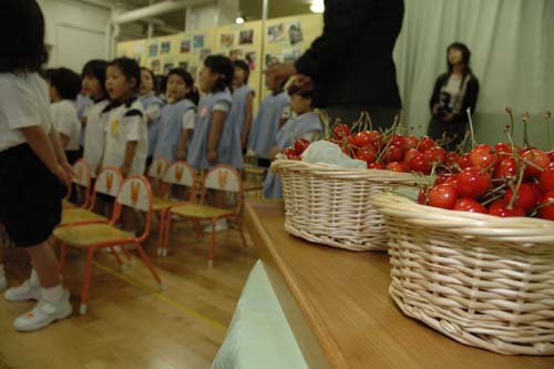 6月27日(水)東根市果樹研究連合会から区立幼稚園14園の子どもたち1,165人に特産のサクランボ約45kgがプレゼントされる贈呈式(サクランボをいただく会)が、中央区立明正幼稚園(新川2-13-4)で行われました。