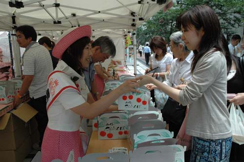 6月28日(水)東根市の観光と名産品であるさくらんぼのPRを目的として「第7回中央区さくらんぼ祭」が開催されました。900パック用意された真っ赤なさくらんぼは、1時間半ほどで売切れてしまいました。さくらんぼ以外にも東根市の特産品である「おし麩」や自分たちで種飛ばし大会が開催できる「さくらんぼ種飛ばし大会競技セット」というユニークなものもありました。