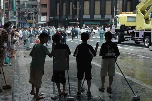 22日(日)、町会、交通少年団、消防少年団、近隣のデパート・商店、会社の人たちが、天下の名橋「日本橋」で、年1回恒例のアカ落とし行事、今年で37回を迎える「日本橋橋洗い」は、1,400人が参加して行われました。参加者はたわし、デッキブラシ、バケツ、サンドペーパーなどの清掃用具を持ち、消防団が散水した所から洗剤を含ませたたわしなどで、泡を作りながら、ていねいに磨いていました。最後は、橋ばかりでなく川もきれいにしようと、元気玉(EM有用微生物群の入ったどろだんご)を3000個、号令により一斉に橋の上から投げ入れました。