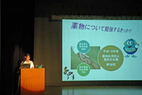 中央区保護司会会長、中央区長や来賓の方々のあいさつに引き続き、「薬物乱用防止活動の話」というテーマで、国連ヤング大使の都立晴海総合高校3年、若林芽(わかばやしめい)さんの講演を聞きました。若林さんは「民間国連ヤング大使」のメンバーに選ばれ本年3月オーストリアの国連薬事犯罪オフィスに11日間派遣されました。その経験に基づき、パワーポイントを駆使した講演に来場者は真剣に聞き入っていました。その後、晴海総合高校筝曲部の琴合奏、区立日本橋中学校吹奏楽部の吹奏楽を聞きました。すばらしい演奏にしばらく拍手が鳴り止みませんでした。