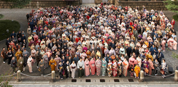 都の歴史的建造物に指定されている常盤小学校の校庭で、着物姿の一般参加の方々を対象に大集合写真を撮影します。