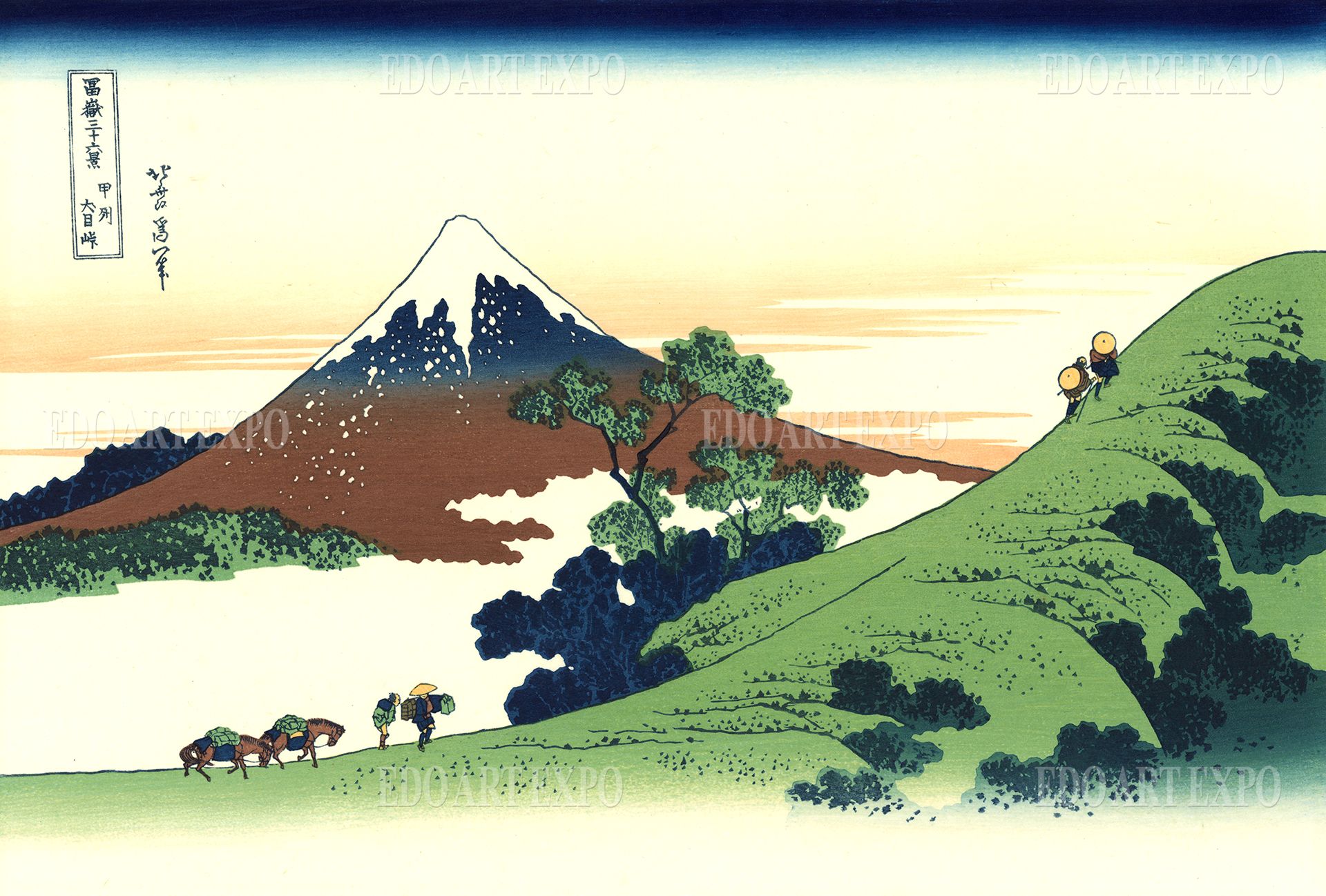 葛飾北斎が描いた犬目峠(現・山梨県上野原市)は、標高が高く富士山を望む絶景のポイントと記されています。本図には、なだらかな稜線が画面を斜めに分け遠方に富士山を望む、雄大な自然の景観がのびのびと描かれました。北斎は八十歳を過ぎてからも、旅ができるほど健脚であったことで知られます。