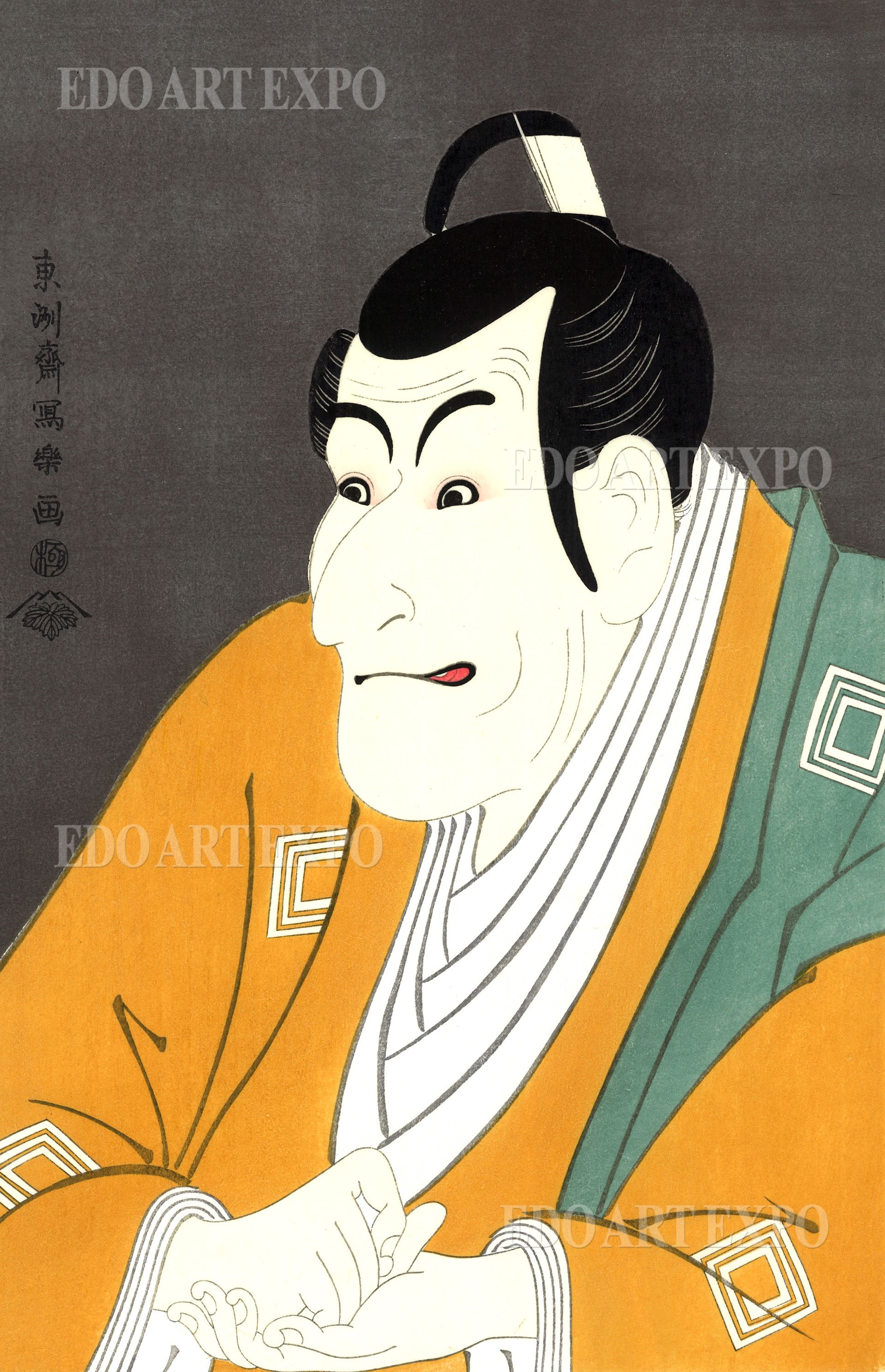 東洲斎写楽は人物の上半身を大きく描いた「大首絵(おおくびえ)」の役者絵を得意とし、約十ヶ月の短い期間に百四十枚前後の作品を残しました。写楽の代表作といえる本図は「恋女房染分手綱(こいにょうぼうそめわけたづな)」という歌舞伎の演目で、忠義心の強い竹村定之進(たけむらさだのしん)を演じる当代きっての名優・市川鰕蔵(いちかわえびぞう)を、堂々たる存在感で見事に描写したものです。