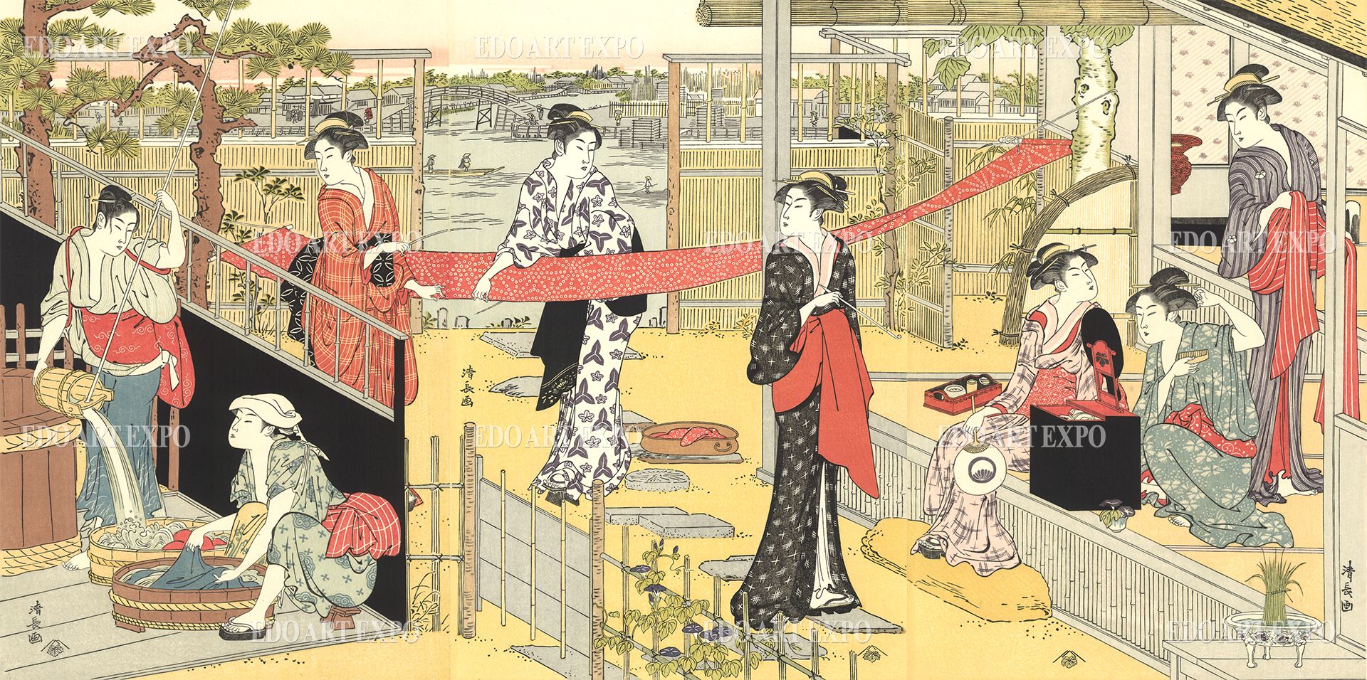 鳥居清長は本図のように紙を二枚、三枚と連ねた「続き物」と呼ばれる、大画面を盛んに手掛けました。清長が三枚続きに描いたこの「洗い張り」の仕事風景は、一図だけでも完成した作品になるよう工夫されています。八頭身の健康的な女性を写すことを得意とした清長は、夏の朝に働く女性のさまざまな姿を美しく描き出しました。