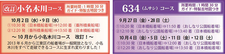 第6 回EDO ART EXPO 会期中に一人でも多くの皆様に水辺の魅力を知っていただくために、通常よりお得な特別便を運航します。中央区・日本橋と墨田区・東京スカイツリーの真下の船着場を結ぶ「634( ムサシコース)」と、江戸の大動脈・小名木川を走破する「改訂・小名木川コース」の2 コースをご用意しました。この機会に、まるで江戸っ子のように、中央区と墨田区・江東区の水路を舟でつないぎ、EDO ART EXPO の展示会場などをご遊覧ください!