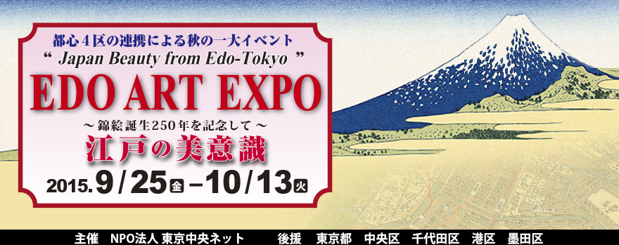 NPO法人東京中央ネットでは、既存の建物をパビリオンに見立て、江戸から続く伝統や文化、歴史を紹介する「EDO ART EXPO」を毎秋に開催してまいりました。本年で8回目をむかえたこの事業は、中央区、千代田区、港区、墨田区の名店、企業、ホテル、神社仏閣や文化・観光施設などが協力して催す一大イベントです。