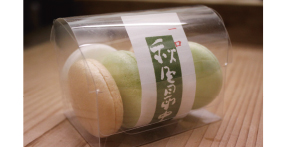 抹茶「天の極」を使用し、職人が手で感覚を合わせた生地をじっくり手焼きしました。抹茶と相性のよい大納言の入った一品です。