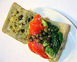 4. チャパタに上記1、2、スモークサーモンの順でのせ、上からケーパーをのせる。