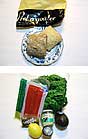 1. 縮みほうれん草は固めに茹でて水に取り、固く絞って5センチ位に切る。オリーブオイルを廻しかけ、塩、胡椒をふる。