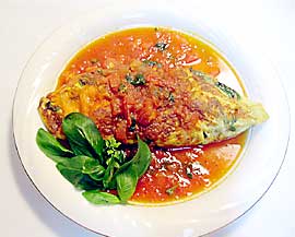 6.皿に5.を盛り付け、上に3のソ−スをかけ、好みでパセリかバジルの葉を飾る。