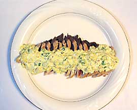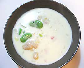 3.2に白ワイン、ロ−リエを入れて強火にし、水を加えかき混ぜながら煮立たせる。一煮立ちし、生クリ−ムを入れて煮たのち、そら豆も加えてとろみがつくまで煮る。塩、コショウで味を調え、