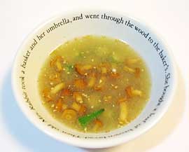 2.鍋に水2カップと中華ス−プの素を入れて火にかけ、煮立ったらなめこ、そばつゆを加え少し煮る。