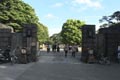 明治時代は職員宿舎だった「芳梅亭」は、震災や空襲の影響を受けず、そのままの姿を残す庭園唯一の建物です。障子やふすまを外すと大広間になり、現在は句会や茶会等、貸し出しの集会施設としてのみに使われているため、普段は外側からしか見学ができません。高い塀で囲まれていますが、格子戸から中を覗くと、整然と植えられた庭木の奥に、引き戸の玄関、左に続く縁側等、日本家屋が見られます。 |