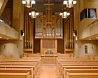 銀座の街の一角に建つ「銀座教会」。その歴史は1890(明治23)年に遡ります。築地居留地の、米国メソジスト監督教会の流れを汲むプロテスタントの教会が、この地に移転したことに始まり、震災や戦災等を乗り越え、現在は、地上8階地下2階の建物で4度目の建設になります。3〜4階が吹き抜けの大礼拝堂は、昭和18(1943)年から正午礼拝(月〜土曜日)が行われ、近くで働く人やショッピング途中の人が訪れ、30分間にわたり、祈りのひとときを過ごします。また水曜日のこの時間には、教会の音楽主任兼オルガニストの草間美也子さんが、バッハの宗教曲等を演奏する「オルガンの調べ」を開催。クリスマスイヴの燭火(しょっか)礼拝等もあり、入場は自由です。 |
