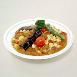 カレーの上には、鳥肉のソテー他ししとうやプチトマト、揚げナス、ブロッコリー、コーンと野菜たっぷりで栄養満点です。