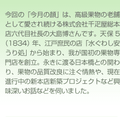 平成 17(2005)年夏完成予定の新本店ビル(38階建て大型複合ビル、仮称・室町三井新館新築工事)に構える店のプロジェクトは、私にとって一世一代の大事業であると言えるでしょう。平成14(2002)年5月から仮店舗へ移転していますが、このビルの完成に合わせて「果物文化を伝える」というコンセプトの元、1階は果物や果物関連食品の物販、2階はフルーツパーラーとレストラン、地下鉄の駅と繋がる地下1階には気軽にテイクアウトできるお店をオープンする予定です。また、これに伴い千疋屋ブランドのリヴイタルプロジェクトも進行中で、お客様に愛されるブランドとしての在り方を追求しています。