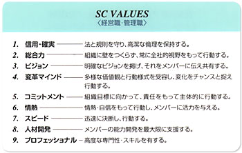 | 350年の昔、初代・住友政友の遺した「文殊院旨意書」に示されている “信用を重んじ、確実を旨とする”という言葉が、住友の事業精神として永く受け継がれています。当社ではその内容を現代的なわかりやすい表現にし、1998年に経営理念と行動指針を掲げました。更にはこれをベースに、社員一人ひとりが誠実に守るべきこととして9項目の「SCバリューズ」を作成しました。これを小さなカードにし、社員は常に携帯するようにしています。英語版も作成し海外で働くナショナルスタッフも持っています。 |