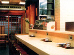 入り口の赤レンガが印象的ですね。威勢のいい挨拶で迎えてくれる板前さんたちも、きびきびしていて、いかにも昔ながらのお店という感じがします。オフィス街にあるのに、2階の座敷は落ちついた雰囲気でとても静かですね。お料理を待つ間、床の間のお花が目を楽しませてくれます。 |