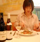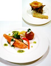 お料理のどれをとっても、野菜やソースなどの色合いが鮮やかで美しく、崩して食べるのがもったいないという感じさえします。「すずきのポアレ白ワインソース、トマトリゾットと季節の野菜添え」は、上品なトマトリゾットの上に肉厚のすずきのソテーがずっしり。その上にカラッと揚がった笹がきゴボウと薄切りのレンコンがふんわりとあしらわれ、お皿をおおう白ワインソースはサフランの風味と色が絶妙のバランス。周りに散りばめられた目が覚めるような季節の野菜の色合いとシャキッとした歯ざわり。ひとつひとつに手が込んでいて素材に対する思いやりを感じます。ソムリエの方に選んで頂いたワインもとても飲みやすかったです。繊細なお料理なのに、ボリュームがあり期待以上です。 |