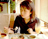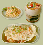 いつもは、お昼休みを利用して「ランチバイキング(1000円)」を頂くことが殆どです。内容は、日替わりなのですが、例えば、豚肉の厚切りが入った鶏がらスープにニンニクチップをまぶした「ゲンチュウ」や、豚肉をドレッシングであえたサラダ「ヤムムー」、また野菜がたっぷりの本格的な「焼きビーフン」や「チャーハン」等。どれもちょっぴり辛くてあとを引く美味しさです。この他、スープやデザート2品等、全14種の本格的なタイ料理を好みの量だけ食べられて、ランチには最適だと思います。中でもタイ風カレーは、辛味のとココナッツミルクがマッチした濃くのある味が絶妙で、特に毎回楽しみにしているメニューのひとつです。 |