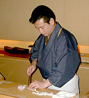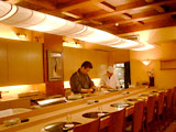 ふぐちょうちん(ハリセンボン)が飾られた風情ある佇まいの入り口を入ると、近代的なビル街からは一転して、静かでゆったりとした和風のスペースが広がっています。モダンジャズが心地よく流れ、外観からは想像できないおしゃれな造りに驚かされました。カウンターの上にある照明が、ほんのりと店内を照らし、テーブル席横の壁には、若主人がドイツの公邸料理人だった時代に作った晩餐会のメニューがさりげなく飾られ、インテリアのひとつとして、お店によく溶けこんでいます。改装時、以前のものをそのまま残したという重厚なケヤキの天井が内装のベースになっていて、斬新なストライプの床等全体の色合いとしっくりマッチしています。随所にリラックスできる、さりげない気配りが感じられ、さすがに最高のお料理と、サービスを重ねてこられた老舗なのだと感心し、憧れのお店に初めて足を踏み入れることができた喜びで、胸がいっぱいになりました。 |