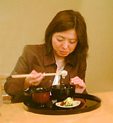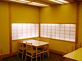 「吉兆 ホテル西洋銀座店」では、お客様にお気軽にいらしていただけるよう数寄屋造りの中にテーブル席をご用意しました。設計された先生は、「新数寄屋」とおっしゃっていました。企業用の接待と言うことを考慮し、2名〜最大14名までの個室をご用意しておりますが、料亭との差別化を計るため畳席はございません。お昼は女性のお客様が多く、土日のお日和がよい時は、結納といったお祝の席をご用意することも多いです。場所がら、外国からお見えになるお客様もいらっしゃいます。 |