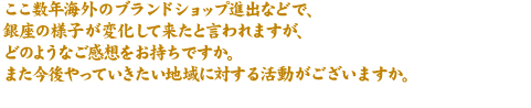若い女性のお客様が増えているのは事実で、ある意味では良いことだと思います。しかし、銀座の商人の生き様は、もてなしの心にあるので、商品がマスプロ化すると同時に接客もマスプロ化していることには少々危惧を感じています。老舗の良さは、商品に対する専門的な知識をしっかり持った人間がいて、個々のお客様に的確なアドバイスが出来ることでもあります。買う方も、売る方も少々ゆとりの無い時代になってしまったというのが昨今の実感です。しかし、これからのショッピングは、“癒し”と“憩い”がキーワードになるのではないでしょうか。われわれはそれを十二分に提供できる専門店、老舗としての技量を積極的にアピールしていくことが重要だと考えています。また銀座に来なければ手に入らない、味わえないという特異性を持つことも大切だと思います。