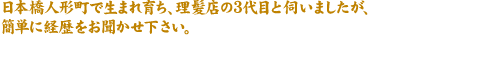 芳町花柳界、芸者屋町の中心部にあたる、人形町大通りから浜町に通じる甘酒横丁の床屋の次男として現在の地で生まれました。店は大正元(1912)年に父が開業しました。店を継いだ年の離れた兄は戦死し、空襲で店も焼け、戦後の混乱期に意気消沈している父母の気持ちを思い、私が継ぐ決心をしたのです。旧制中学4年の時でした。昭和20年3月の東京大空襲の時は、浜町方面から焼け出された人たちが押し寄せて、父母とともに避難しました。宮城まで逃げたものの、入れずに仕方なく近くの明治生命ビルで一晩を過ごし、翌朝に戻ると、浜町河岸の明治座からこちらはすっかり焼け野原で、私は、茫然自失の状態でしたね。たくさんの人々が亡くなり、焼け出されるというひどい有様でした。この戦災で古くから住んでいた多くの人たちが、流出してしまいました。店を再開したのは、昭和27年のことです。以来半世紀に渡り、変わらずここで床屋を営んでいます。 |