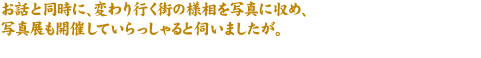 ここは昔は海だったこと、徳川幕府が出来、商業の街を作ったこと、銀座(銀貨の鋳造所)があったこと、幕府の崩壊後、無血開城の功績で西郷隆盛がここに屋敷を拝領していたこと、米穀の取引所が出来、日本のウォール街と言われたことなど、写真や自身の子供の頃の話を交え面白おかしく歴史の話をします。「学級崩壊」などが叫ばれていた頃などは、子供たちが話を聞いてくれなかったらどうしよう、と不安に思ったこともありましたが、みんな目を輝かせて熱心に聞いてくれました。「初めて聞く話で、とても面白かった」と感想を書いてくれる子供たちがたくさんいて、こういう活動をやっていて、本当に良かったと思いました。 学校の歴史教育では、詳細な地域のことまでは伝えられません。昔は家族の中には、物知りのおじいさんやおばあさんがいて、それぞれの家庭で子に孫にと語り継いだような話です。現在の核家族の時代には、話をする人間がいませんし、ご両親でさえ知らないことでしょう。自分の住む地域のことを正しく知り、愛着を持って欲しいと思います。 地名を例にとっても、人形町、箱崎、中洲(なかず)といった発音のアクセントが昔からのものとは違ってきています。江戸の言葉は平坦で、アクセントは付きません。違った発音が流布し、いつの間にかそれが正しいことになってしまうのは、困りますね。しかしながら、だれも注意しないし、教えてもくれません。私たちが少しづつでも知らせ後世に語り継いでいかなければ、江戸から明治、大正、昭和と延々と受け継がれてきたものが途絶え、変質して行ってしまうのです。変わるべきものは変わって結構なのですが、変わるべきではないものもあります。 ![]() 昭和28年頃に、写真屋さんが近くに出来たので、界隈の写真愛好家が集まり「中央銀影会」というサークルをつくりました。 |