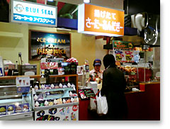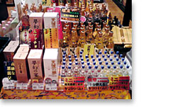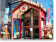 地下1階は、泡盛や蛇三線などのお土産物が中心に展示されています。泡盛は棚1面とテーブルの上にも並べられ、試飲できるものもありますので、お酒好きの方にはお薦めです。 食べ物が中心の1階は「ゴーヤ」「海ぶどう」やめずらしい種類の「ちんすこう」「食塩」など、見ているだけでも楽しくなる商品がたくさんあります。また、奥には「ブルーシールアイスクリーム」などが食べられる飲食コーナーもあり、沖縄のマチグァー(市場)を体感できます。