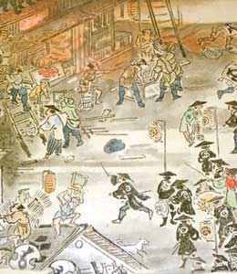 江戸の町の発展にとって、切っても切れないものに火事があります。「火事と喧嘩は江戸の花」と言われるほどに火事は多かったのですが、なかでも江戸城完成の17年後(1657年)に起こった「明暦の大火(振り袖の大火)」はすさまじいものでした。火は二日間にわたり燃え続け、江戸市中の大半と江戸城のほとんどを焼き尽くし、亡くなられた方は10万人以上にも及んだと言われています。