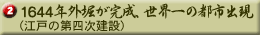 2年後に江戸城は復興されますが、その際、大天守は復元されませんでした。この明暦の火事をきっかけに、江戸城、市中ともに改造が行われました。その一つは、江戸城郭内に火除け地として西北からの火事の延焼を防ぐため、吹き上げ庭を設けました。これにより城郭内にあった武家屋敷はすべて城郭外へ移転させられました。その後、江戸は外堀の外へ大きく発展していきます。江戸市中は、その後も六年に一度は大火に見舞われますが、そのつどたくましく復興・発展していきます。 |
