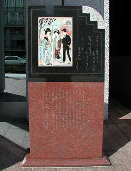 呉服橋交差点から永代通りを日本橋方向に少し進んだ所に竹久夢二の港屋絵草紙店がありました。この絵草紙屋は大正3年に、夢二の妻が亡き夫の商業美術への意欲を具体化するために開業しました。現在その跡地には夢二の絵を入れ込んだ記念碑が建てられています。