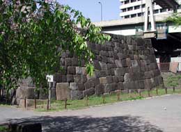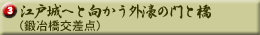 常盤橋門は、江戸城外郭の正門で、この橋は日光・奥州街道への出口でした。橋の名前は、三代将軍家光が金葉集にある古歌「色かえぬ松によそへてあづま路の常盤の橋にかかる藤浪」にちなんでつけました。現在も門の石垣の一部が残され、江戸の町の面影をしのばせています。 |