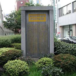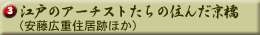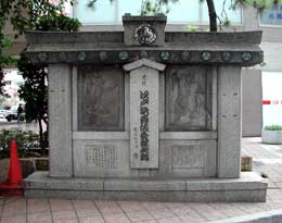 「京橋大根河岸青物市場跡」のとなりに「史跡江戸歌舞伎発祥之地」の碑があります。これは日本橋と京橋の中間に架かっていた中橋の江戸歌舞伎の創業を記念したものです。江戸歌舞伎は1624年(寛永元年)中村座の猿若勘三郎が中橋で櫓をあげたことに始まります。その後市村座、森田座も上演を公認され、江戸歌舞伎三座が集結し、中橋には多くの人々が集まりました。 |