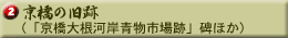 1664年(寛文4年)に京橋川の水運を利用して、京橋の北詰西側に野菜の売り場が設けられました。この青物市場には大根の入荷が多かったため、「京橋大根河岸市場」と呼ばれ、明治になってからは「京橋青物食物河岸」と呼ばれました。明治の終わりには現在の京橋3丁目と八重洲2丁目の南部、対岸の銀座1丁目の西部にまで規模が広がり、青物・菓物のほか、魚類・乾物も扱うようになりました。大正時代には関東大震災の被害を受けましたが、卸問屋・仲買による組合の努力により、問屋68軒、仲買105名に達しました。しかし、1935年(昭和10年)に築地の東京卸売市場と合併、移転しました。「京橋大根河岸青物市場跡」の碑は1959年(昭和34年)に関係者により建てられました。