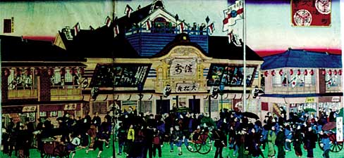 久松座とは現在の明治座のこと。1873年(明治6年)に「喜昇座」として始まり、後に「久松座」「千歳座」の名称を経て1893年(明治26年)に「明治座」となった。現在の劇場は平成5年に浜町センタービルの1〜3階にオープンした。 |