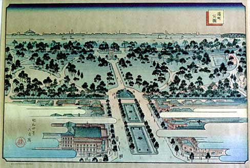 浜町公園は昭和4年に開園、江戸時代は熊本藩細川家の下屋敷の庭園。現在整備工事が行われている(平成15年3月完成予定) |